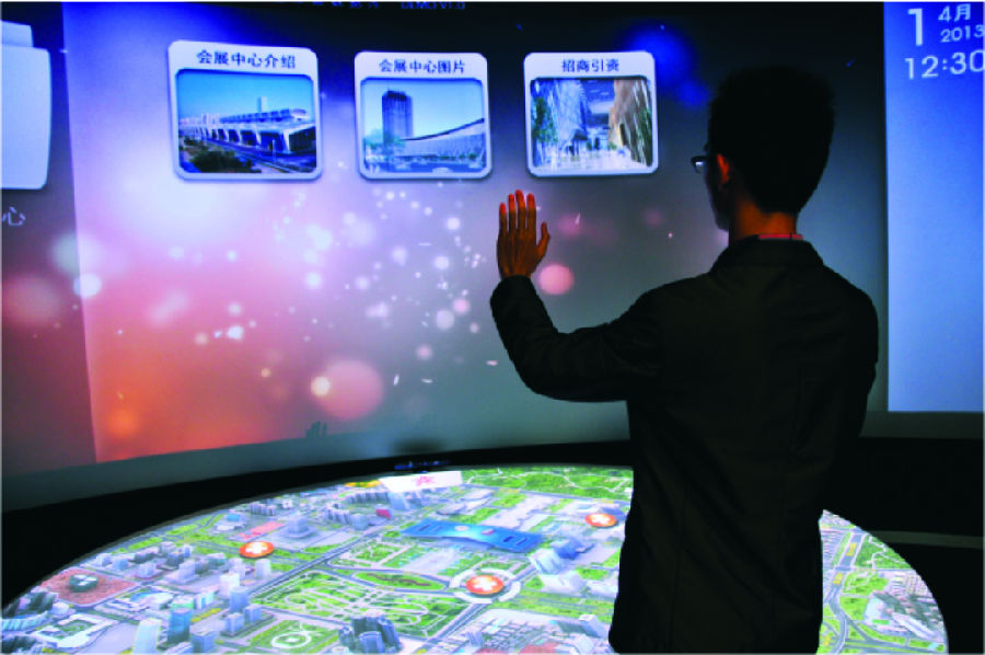 以計(jì)算機(jī)技術(shù)為核心的現(xiàn)代高科技手段生成逼真的三維圖像模型,借助投影顯示設(shè)備或其他顯示設(shè)備把計(jì)算機(jī)上的三維或四維圖形圖像模型顯示到臺(tái)面上 ……